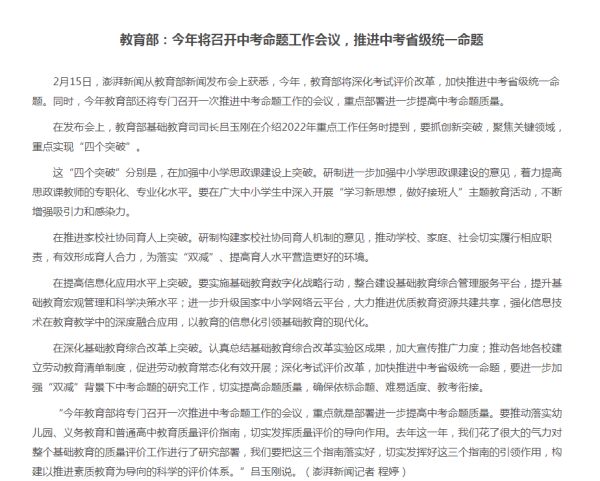 在2月中旬,教育部在相关文件中提出了加快中考命题改革,推进省级教育厅统一命题的进程的议案,表示要进一步深化“双减”改革的推行。